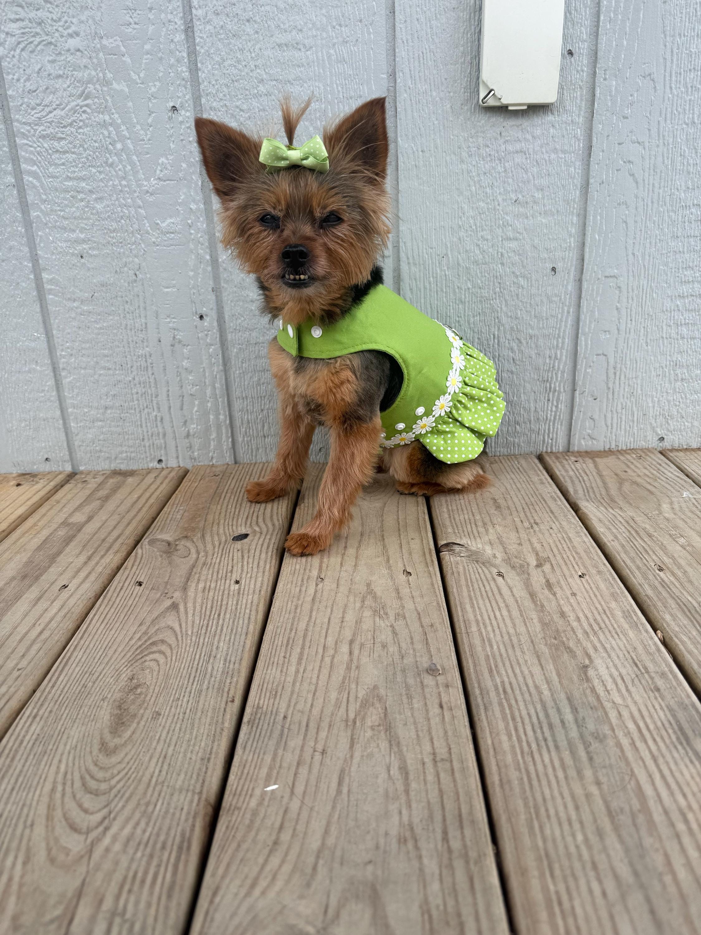 Cute green and white polka dot dog harness ruffle. This cute harness ruffle is the perfect addition to your fur baby's wardrobe. It is made from green and white cotton polka-dot fabric and daisys. The harness is fully lined and washable on the delicate cycle. Lay flat to dry. The measurement chart is in the photo gallery. Please reach out to me for any questions you may have.
